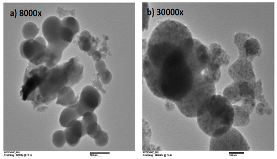 TEM images for a TiO2 sample with 24% anatase and amplified by (a) 8000× and (b) 30,000×.