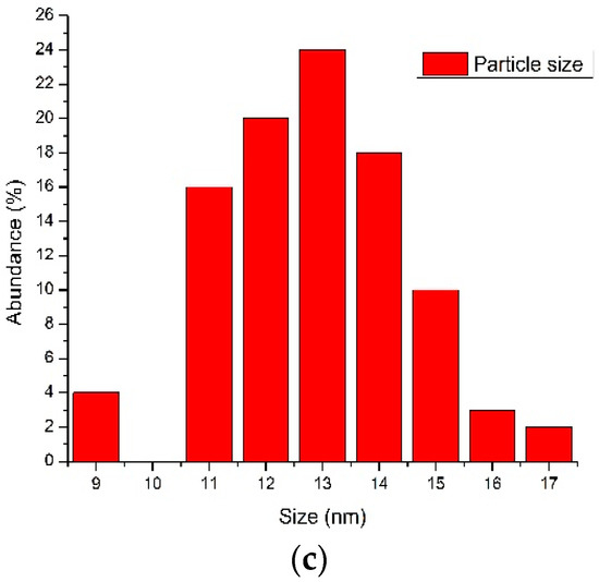 Transmission electron microscopy (TEM) at 100,000× for TiO2 sample containing 24% A in two different zones (a,b) and (c) shows the particle size distribution for these two zone.