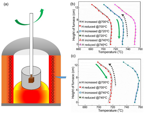 The principal component of the crystal growth equipment is a tube furnace with electric stove wire as the heating source. The furnace is designed with a special and stable temperature gradient along the axial direction. The schematic diagram of the crystal growth equipment is shown in Figure 1a. It is known that the thermal profile is crucial for crystal growth. Prior to the single crystal growth, the thermal gradient should be determined. In this work, for evaluation of the thermal gradient, the temperature was measured from the bottom of the crucible to the top, and then from the top back to the bottom. To ensure the accuracy of the measurement, the temperature gradients were measured at different temperature points and for each measurement, the dwelling time was kept for 10–15 min. Figure 1b,c present the optimized temperature gradient distributions in the furnace for α-BIBO and BZBO crystals, respectively.