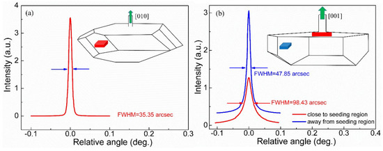 The qualities of the grown α-BIBO and BZBO crystals can be evaluated by using the high-resolution X-ray diffraction (HRXRD) method. In our study, the HRXRD tests were performed using a Bruker-axs D5005HR diffractometer (Bruker-axs, Karlsruhe, Germany) equipped with a two-crystal Ge (220) monochromator set for Cu-Kα1 radiation (λ = 1.54056 Å). The accelerating voltage and tube current were 20 kV and 30 mA, and the step time and size were 0.1 s and 0.001°, respectively. The measured crystal wafers were (010) facet for α-BIBO crystals and (001) facet for BZBO crystals, with both sides polished.