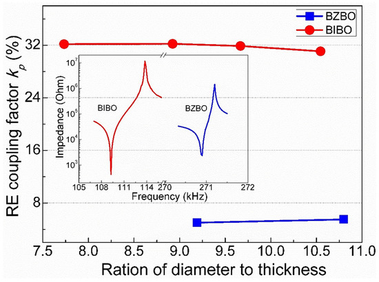 Figure 5 shows the obtained kp values for the Y-oriented α-BIBO and Z-oriented BZBO crystal discs. The small inset gives the recorded impedance-frequency spectra for the radial extensional vibration modes. It was observed that the difference of resonant and anti-resonant frequencies for the radial extensional mode of α-BIBO was larger than that of BZBO crystal. The kp values were determined to be in the order of 32.0% and 5.5% for the α-BIBO and BZBO crystals, respectively.