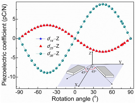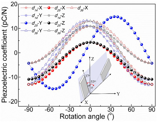For α-BIBO single crystal, as shown in Figure 6, the shear mode piezoelectric coefficient d25 was found to be more sensitive to the rotation angle, compared with d14 and d36. The variations of the d14 and d36, rotated along the three physical axes, were symmetrically distributed, referring to the rotation angle at 0°. The piezoelectric coefficient d25 changed from −13 pC/N to 4.3 pC/N, and from −10.9 pC/N to 4.3 pC/N, as the angle rotated around the X- and Z-axes, respectively. In contrast, the largest piezoelectric coefficient d25 (YZ cut) was obtained and found to be in the order of 14.8 pC/N and −14.8 pC/N, when the rotation angle reached at 37° and −53° around the Y-axis (the small inset of Figure 6), respectively, more than two times that of langasite crystal (d14 = −6.01pC/N) [32].