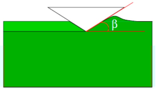 In [] cone scratching with an indenter angle β = 22° (see Figure 2) was performed on six different materials including three polymers and three metals. A diamond indenter was used in order to secure as much as possible a non-deforming stylus. The normal and tangential forces were recorded and, among other things, normal and scratch hardness were recorded.