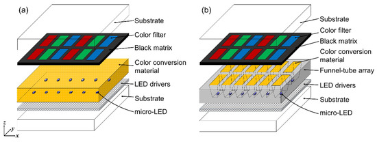 Schematic diagram for configuration of full color micro-LED display (a) device A: without funnel-tube array, and (b) device B: with funnel tube array.