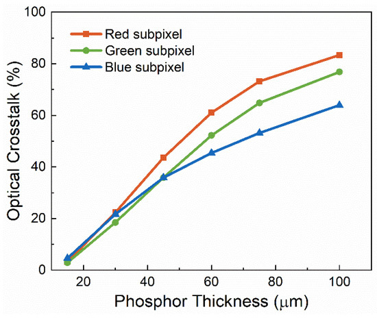 where Ileakage represents the light leakage from the adjacent pixels when only one subpixel is turned on. Figure 3 plots the simulated color crosstalk ratio as a function of the phosphor thickness H in device A. As discussed above, when H increases from 15 µm to 100 µm, the optical path inside the phosphor film becomes longer, leading to a more severe light scattering. Therefore, the color crosstalk of RGB subpixels increased accordingly.