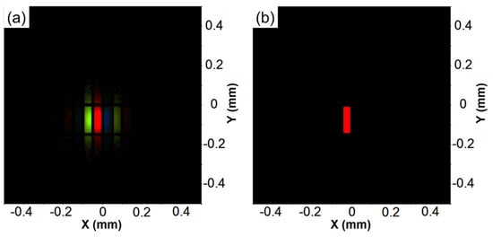 Figure 4 shows the simulated color image of device A and device B, respectively. When only one red subpixel was turned on, while green and blue subpixels remained off, the light leakage from the surrounding pixels in device A was severe. In contrast, with the funnel-tube array in device B, no color crosstalk was observed.