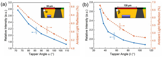 The simulated relative light intensities of device B normalized to that of device A are illustrated in Figure 6. Specifically, in Figure 6a, the taper angle α varied from 72° to 108°, while β was fixed at 37°. In Figure 6b, the taper angle β varied from 31° to 108° when α was set to be 80°. As these figures depict, the light intensity decreased as the taper angle increased. The inner surface of the funnel-tube array contained metallic reflectors to recycle light and elongate the effective optical path inside the phosphors. When the taper angle was larger than 90°, more light was reflected downwards by the inner reflector and then absorbed or scattered by the backplane. On the other hand, when the taper angle was less than 90°, more light was reflected upwards, which then escaped from the device to the air. Therefore, a taper angle less than 90° was preferred to obtain higher light efficiency. However, the ambient light reflection also increased, as illustrated in Figure 6a,b, which would degrade the ambient contrast ratio of the displays. The corresponding relative intensity and ambient reflection are listed in Table 1.