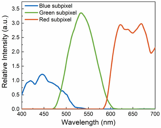 To evaluate the color crosstalk quantitatively, two ray receivers with different detection areas were placed above the color filter in our model. Receiver 1 only collected light from one subpixel area (50 µm × 150 µm); the detected light intensity is Ipixel. Receiver 2 was able to receive light from the whole panel (>> 10 pixels); the collected light intensity is Itotal. We defined the color crosstalk ratio as Rcrosstalk, which can be calculated using Equation (1):
