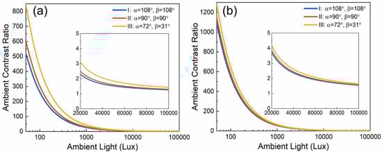In Equation (2), Lon (Loff) represents the on-state (off-state) luminance value of a display, Lambient is the ambient luminance, and RL is the luminous reflectance of the display panel. To calculate ACR, the Lon of structure I is typically assumed to be 600 nits, while Lon of structures II and III can be calculated according to the relative intensity; the results are 752 nits and 1485 nits, respectively. For all structures, Loff is 0, the surface reflection was assumed to be 4%. The calculated ACR of structures I, II, and III are plotted in Figure 8a. As the ambient light got stronger, the ACR decreased dramatically first and gradually saturated. Among these three structures, although structure III had the most severe ambient light reflection, it achieved the largest ACR under different ambient light conditions due to its highest brightness. However, under strong ambient light conditions such as full daylight (~20,000 lux), the ACR of three structures were all ≤ 3:1 (inset of Figure 8a), which is barely readable under sunlight [18]. This relatively low ACR originates from both light scattering by the phosphor particles and surface reflection. To improve ACR, anti-reflection (AR) coating with a surface reflection of about 0.2% could be employed [19]; results are shown in Figure 8b. When Lambient = 20,000 lux, the ACR could be improved to ~4:1. However, when the ambient light continued to get stronger, the light scattering by the phosphor particles dominated and the ACR dropped to below 3:1, indicating the display was hardly readable. A straightforward method to enhance ACR is to employ an absorptive material for the funnel-tube array; however, the trade-off is decreased light efficiency.