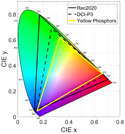 In order to improve the color performance, alternative color conversion materials with narrower FWHM can be employed, such as a combination of green phosphor (β-sialon:Eu2+, FWHM ~ 50 nm) [23] and red phosphor (K2SiF6:Mn4+) [24], or CdSe red/green QDs (FWHM ~ 25–30 nm) [25,26,27]. However, the device structure, especially the thickness of the funnel-tube array, needs to be optimized according to the optical density of the color conversion materials. The simulated color gamut of two-color phosphors and QDs are depicted in Figure 10. The phosphor covered 95% of DCI-P3 standard and 68% of Rec. 2020 standard, and the QDs covers 94% of DCI-P3 standard and 83% of Rec. 2020 standard.