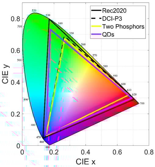 - Zhu, R.; Luo, Z.; Chen, H.; Dong, Y.; Wu, S.T. Realizing Rec. 2020 color gamut with quantum dot displays. Opt. Express 2015, 23, 23680–23693. [Google Scholar] [CrossRef] [PubMed]