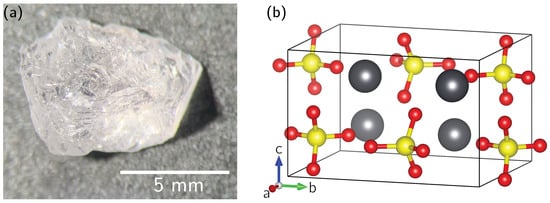 (a) Single crystal of anglesite, PbSO, from Monteponi Mine, Iglesias, Sardinia/Italy (Mineralogical State Collection, Munich inventory MSM 6140). (b) Unit cell of anglesite according to Reference [20]. The lead atoms (gray, located at Wyckoff position 4c) are related by glides , and , , and are co-ordinated by the ten nearest oxygen atoms (red). The sulfur atoms (yellow) are located in the and planes, with their covalent bonds to oxygen in tetrahedral co-ordination also shown. (Drawing generated with the Vesta program [21]).