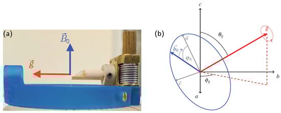 (a) ‘Clip-on’ goniometer built by NMR Service GmbH (Erfurt, Germany) for a wide-bore Bruker static NMR probe, with an arbitrary single crystal mounted on a wooden rotation axis with 5 mm diameter. The goniometer axis (red) is perpendicular to the applied magnetic field (blue). (b) Co-ordinates used for the interpretation of the rotation patterns (Figure 3b,d); a, b, and c are the unit vectors of the orthorhombic crystal system () of anglesite, is the unit vector along the goniometer axis, and its polar angles in the , is the unit vector of the magnetic field, is the rotation angle, and and are auxiliary unit vectors necessary to define perpendicular to [15].