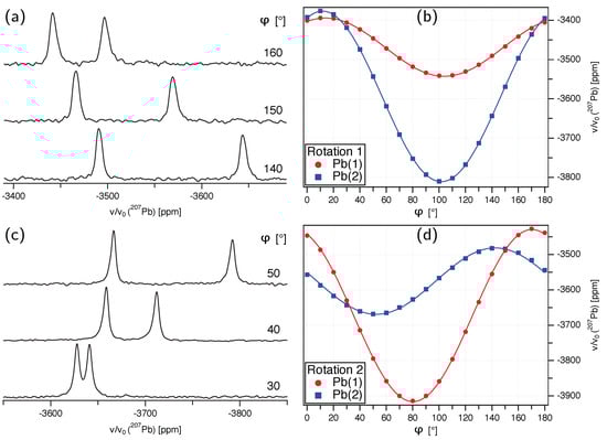 From fitting the experimental line positions in Figure 3, we obtained two sets of prefactors ( and ) from the Volkoff harmonics, see Equation (11). Since the rotation was carried out around one physical goniometer axis , the two harmonics of the magnetically inequivalent lead atoms are linked by one constraint [14], and only five linear independent parameters may be extracted from one rotation pattern. The chemical shift tensor , which we want to calculate from the rotation pattern, possesses four independent tensor elements (Equation (10)) due to constraints imposed by crystal symmetry. However, there are also two parameters (, ) describing the unknown orientation of the goniometer axis in the frame, plus the unknown initial orientation of the crystal expressed by offset angle , which need to be included into the fit routine. Overall, therefore, our system is underdetermined, with seven fit parameters versus five experimental ones. The obvious solution to this problem is to acquire two rotation patterns about two different rotation axes, (Figure 3b) and (Figure 3d), yielding enough free parameters to also include the orientations of and into the fit. Thus, the two rotation patterns were simultaneously fitted according to Equation (12) (and its symmetry-related counterpart), with the motion of field vector in the frame described by Equation (15). The fit converged on a global solution with the following values for the ten parameters (the errors reflect the fit residuals):