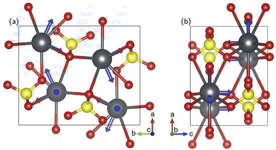 The orientation of the scaled eigenvectors of the CS tensor in the unit cell of anglesite, as listed in Table 1, may be visualised from Figure 4. These orientations are in agreement with the crystal symmetry, with the eigenvector of one of the lesser tensor components () aligning exactly along the c axis in the crystal frame. This is a consequence of the symmetry enforced by the mirror plane in the orthorhombic unit cell at Wyckoff position 4c, on which the Pb atoms are situated. This generates CS tensors of the shape shown in Equation (10), where the principal component S does not change when transforming from the to the frame. The eigenvectors belonging to the two other principal components are free to orient according to the electronic environment, generated chiefly by the surrounding oxygen atoms. The eigenvector with the second largest corresponding eigenvalue, i.e., , points exactly along the bisector of the next two nearest oxygen atoms with the same Pb–O distance, as may be best seen in the lower-left corner of Figure 4b.