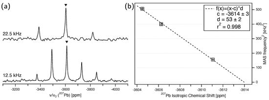(a) Pb magic-angle spinning NMR spectra of polycrystalline anglesite, acquired at the indicated MAS frequencies, with isotropic bands marked by a triangle. (b) Plot of the Pb isotropic chemical shift of anglesite versus the squared MAS frequency, with the linear fit given by the dashed line. An extrapolation to zero spinning speed results in an isotropic chemical shift of ppm.