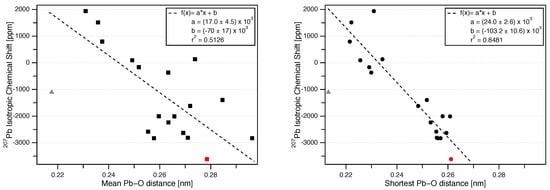 (Left) Evolution of Pb isotropic chemical shift () versus mean Pb–O distance for compounds where lead occurs solely in oxygen co-ordination, with anglesite shown in red. (Right) versus the shortest Pb–O distance. All data given in Table 2. (Dashed lines show the least-squares linear fit, with fit parameters and their errors given in the upper-right corners. The data point for Pb(1) in PbO (Minium) is shown as a gray triangle and was not included in the least-square fits, as the correlation was restricted to only Pb).