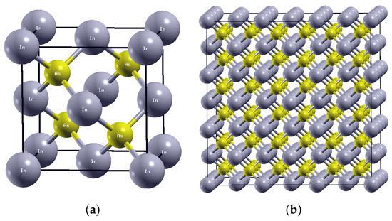 Under ambient conditions, InAs crystallizes into a cubic zinc-blende () geometry with space group (T) [24]. The atomic structure of pristine zb-InAs in a conventional eight-atom unit cell is depicted in Figure 1a, and we will limit our study to this type of crystalline structure. In this computational study, we primarily focus on the formation energy of various point defects, providing insights in understanding defect energetics within the bulk InAs crystal. For enhancing accuracy, our calculations are performed at the Ab initio level using density-functional theory (DFT). Generally, DFT describes reasonably well the structural properties, such as lattice constants and bulk moduli [25]. For a more accurate description of defect structures, we have carried out the investigation with enlarged simulation cells (216 lattice sites systems) to ensure that the accuracy is within 0.02 eV/cell. A supercell with 108 In and 108 As atoms and referenced for defect calculations is illustrated in Figure 1b. Our study aims to provide an extensive and accurate study of the intrinsic point defect formation which is missed in the literature, e.g., a very recent computational study [26], but is highly desirable.