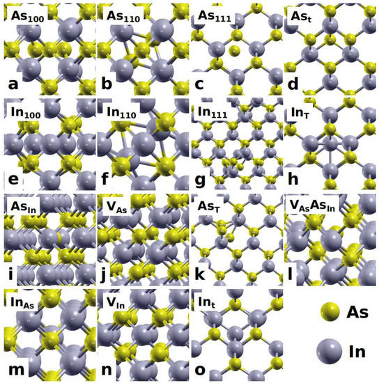 The defects in Figure 2 are divided into five groups. Group-1 is the dumbbell interstitial-type point defects. The dumbbell configuration is characterized by two atoms of the same species sharing one lattice site. There are three typical orientations: , , and . Therefore, there exist totally six dumbbell configurations: (a) As, (b) As, (c) As, and (e) In, (f) In, (g) In as seen in Figure 2. Group-2 is the tetrahedral interstitial-type point defects. There are two kinds of tetrahedral sites in a zb-InAs lattice: one is formed by four In atoms denoted as t site, and the other is formed by four As atoms denoted as T site. Both In and As atoms could take either atom site, resulting in four tetrahedral interstitial-type point defects: (d) As, (h) In, (k) As, and (o) In as presented in Figure 2. Group-3 is the substitutional point defects, where a pristine As site is replaced by an In atom, or vise versa. The two intrinsic substitutional point defects in zb-InAs are (i) As and (m) In as shown in Figure 2. Group-4 is the vacancy-type point defects. There are two types of intrinsic vacancy-type point defects in zb-InAs: (j) V and (n) V, as displayed in Figure 2. The last Group-5 is a point-defect complex such as VAs, which is formed by an As vacancy V combined with a substitutional As atom on the nearest-neighbor In site (As), as demonstrated by Figure 2o. This defect is interesting because an In vacancy V could attract a nearby As atom to fill it up, resulting in the VAs complex. It is worth pointing out that the relaxed atomic structures of the dumbbell interstitial-type defect of In and tetrahedral interstitial-type defect of As are also point-defect complexes, indicating they are highly unstable. Next, we investigate the formation energies of all these different types of defects.