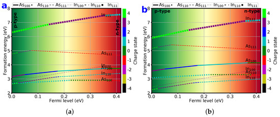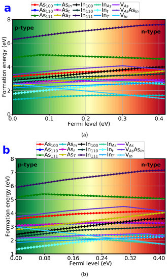 Since the exact value of the chemical potential in Eqaution (1) cannot be determined, it is treated as a parameter for the formation energy calculations. As such, the defect formation energies are given in the limiting conditions of As-rich and In-rich growth regimes. In the As-rich regime, the chemical potential of As atoms is assumed to be the value in bulk As, whereas in the In-rich (As-poor) regime, it corresponds to the chemical-potential difference between InAs and bulk In (and vice versa for the chemical potential of In). For an in-depth discussion of formation-energy calculations, the reader is referred to the following papers [27,28,29,30].
