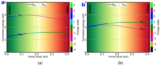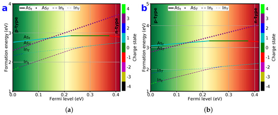 Next, we consider substitutional intrinsic point defects. Since we have two elements in the pristine zb-InAs, there are only two substitutional intrinsic point defects, i.e., As, and In. The formation energies of these two substitutionals as functions of are displayed in Figure 6 for both As-rich and In-rich chemical environments. As seen in this figure, the formation energies of substitutionals are greatly affected by chemical environment. Under an As-rich environment, As has a relatively low formation energy, and is at least 1 eV lower than that of In. This result indicates that As atoms tend to replace In atoms at In lattice sites. As a result, the As concentration will be much higher. In addition, As substitutionals favor neutral () or lower positively charged states ().