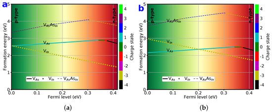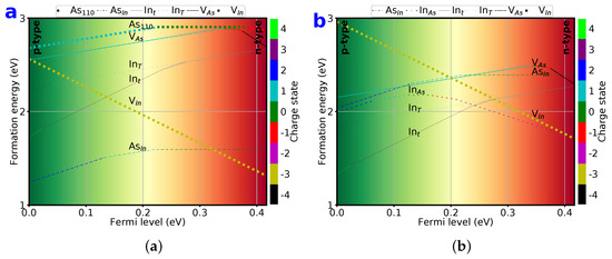 Formation energies as functions of in the As-rich (a) and In-rich (b) environments for fifteen different types of point defects in zb-InAs with all possible charge states from −4 to +4 . The different doping regimes near valance bands (p-type) and conduction bands (n-type) are displayed.