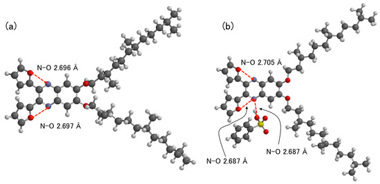 For a molecular design of RPNL 1 to combine the inherently acid-recognizing property, it is indispensable that the two imino-N atoms are accessible from external stimuli, by other substituted moieties in RPNL 1, without any disturbance. Before synthesis of the RPNL 1, we performed DFT calculations to investigate the molecular structure of RPNL 1, by using the Spartan’18 software package (Wavefunction, Inc., Irvine, CA, USA). The optimized molecular geometry of the RPNL 1, calculated at the B3LYP/6-31G* level of theory, revealed that two long alkoxy chains did not interact with the imino-N atoms as acid-recognizing moieties in Figure 1a. Additionally, the interatomic distances between the O atoms on the furan rings and the imino-N atoms were 2.696 and 2.697 Å, which is shorter than the sum of van der Waals radius (O–N 3.07 Å), respectively [29]. This result suggests that interatomic interactions occur between the O atoms on the furan rings and the imino-N atoms pyrazine framework, as a result, the acid-recognizing capability of the imino-N atoms might decrease. Therefore, we also investigated the acid-recognizing capability of RPNL 1 to benzene sulfonic acid (BSA), with lower pKa. DFT calculation of RPNL 1 with BSA revealed that the BSA molecule was capable of approaching one imino-N atom of RPNL 1, because the interatomic distance between the O atom of the BSA and the imino-N atom was accumulated to be 2.687 Å, in Figure 1b, despite a steric repulsion by the alkyl chains, as well as the furan rings. As a result of the hydrogen bonding, the distance between the O atom and the N atom were much shorter than the corresponding sum of the van der Waals radius. Moreover, the interatomic distance between the imino-N atom and the O atom for the furan ring, is almost the same as that before the recognition of the BSA. As a result, the non-bonding interaction between the imino-N atom and the O atom may be weak, which is expected, as the RPNL 1 can recognize an acid substance such as BSA.