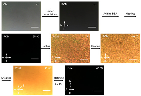 We added BSA (equimolar to RPNL 1) into RPNL 1 to investigate the dissolving behavior of RPNL 1. Upon heating at 100 °C, the BSA was dissolved in RPNL 1, whereas the POM observation of the RPNL 1·BSA (in which RPNL 1 dissolves BSA), showed birefringence, under a cross-Nicols condition, at 25 °C, in Figure 3; of which observation, the result was clearly different from that for RPNL 1. This result implies that RPNL 1 can recognize BSA to form a complex, via hydrogen bonding [18]. Moreover, an appearance of birefringence indicates that RPNL 1·BSA self-assemblies into the formation of an ordered structure. To confirm that a phase transition of RPNL 1 occurs by the addition of the BSA, we carried out the DSC measurements for the RPNL 1·BSA.