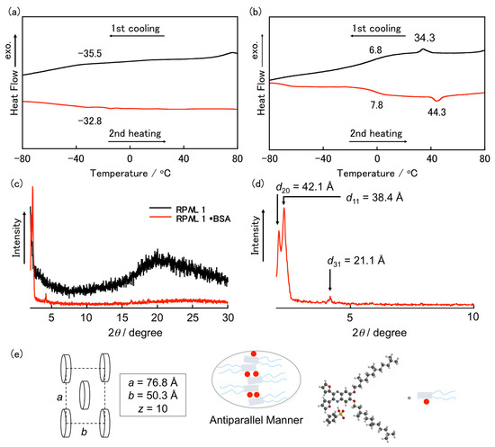 Differential Scanning Calorimetry (DSC) traces of the (a) RPNL 1 and (b) RPNL 1·BSA, on a scanning rate of 10 K/min; (c) XRD patterns of RPNL 1 and RPNL 1·BSA at 25 °C; (d) XRD pattern of the magnified view for RPNL 1·BSA; and (e) Predicted schematic illustration of the molecular packing for RPNL 1·BSA in a disc-like stratum of a column.