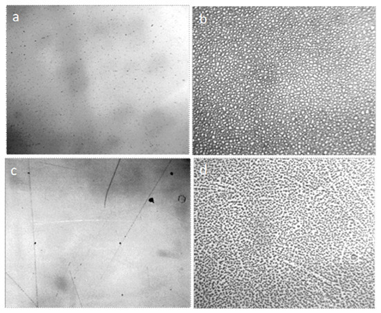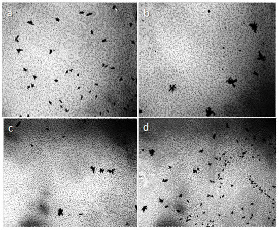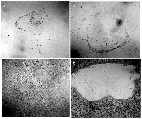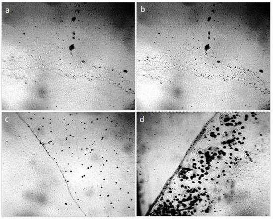 Fragments of dried out smears of the investigated liquids: (a) Distilled water; (b) white dry wine; (c,d) are instant coffee. Agglomerates from the coalesced round structures are shown in Figure 1. The width of each frame is 3 mm.