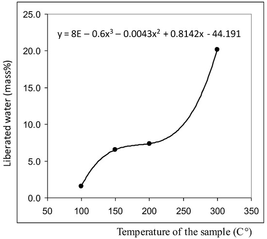 Centrifugation of liquids (5000 rpm, 20 min) did not lead to the formation of a pronounced precipitate, but the smears, prepared on the glasses from the bottom fraction of the centrifuge, contained agglomerates of coalesced round structures with a dark particle in the center (Figure 2). The size of the agglomerates could reach several millimeters. We found that visible circular structures of 10–15 microns in size with a dark microparticle in the center are present both in water (distilled, mineral, tap water) and in aqueous solutions. They have a greater light-scattering capacity compared to liquid water; they are quite plastic and easily stick together under deforming influences [39]. As our experiments have shown, heating the solutions to 100 °C does not lead to the dissolution of the structures. By the results of centrifugation, it can be asserted that their density slightly exceeds the density of water. Extraction of soluble organic substances from the aqueous solution of coffee by hexane and ether does not lead to the disappearance of structures, which confirms their inorganic nature [39]. Using a chromatography-mass spectrometric analysis of a sample of a dried coffee solution, it is shown that the mass of the liberated water relative to the mass of the analyzed sample is nonlinearly related to the thermal desorption temperature and is described by a third-order polynomial: y = 8E − 0.6x3 − 0.0043x2 + 0.8142x − 44.191, when R2 = 1 (Figure 3). It can be seen that in the temperature range of 200–300 °C the amount of water released from the sample sharply increases, which usually occurs when the crystal hydrate complexes are destroyed.