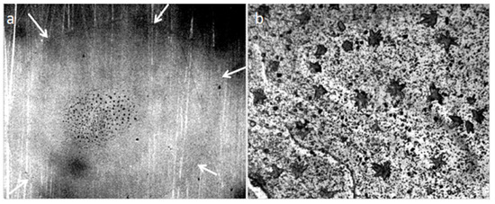 Traces of dried water on a plastic substrate in the open air: (a) a dried drop of distilled water (arrows indicate the outer boundaries of the drop), the center is concentrated hydrophilic dispersed phase; (b) a tap water film poured into a hydrophobic Petri dish with a layer of 2 mm, after 4 weeks of drying. Druzes of grown crystals are located on a GDP film. The width of each frame is 3 mm.