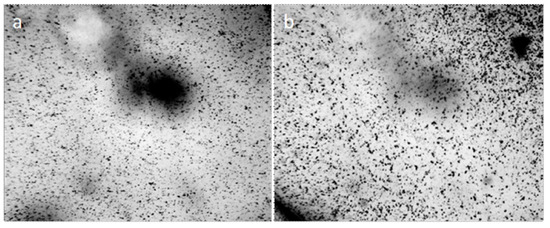 Microscopy of the open surface of an aqueous solution of coffee, poured into a Petri dish, at different temperatures: +20 °C (a) and +4 °C (b). Increase in density and decrease in the size of coacervate structures upon solution cooling. The width of each frame is 3 mm.