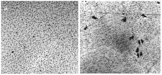 Identification of the structure of the glass (a) and plastic (b) surface via coating them with fine graphite powder. Borders of rounded structures of micron size can be seen. The width of each frame is 3 mm.