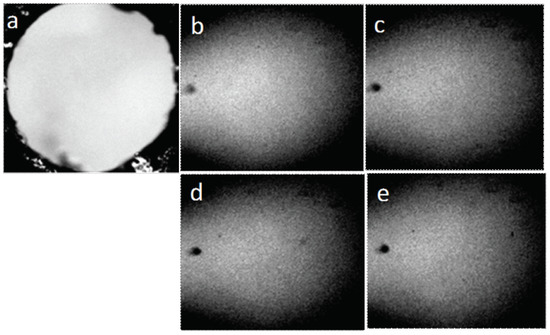 Structure of water placed in the hole in the plastic plate (pore the diameter of which is 3 mm): (a) pore not filled with water; (b–e) water in the pore, four consecutive frames. The width of each frame is 3 mm.