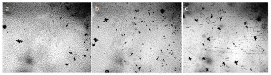 Structure of water and aqueous solutions under an optical microscope: (a) distilled water; (b) instant coffee; (c) white dry wine. The thickness of the liquid layer, bounded by the substrate and cover glass, is ~8 μm. The structural unit of the hydrophilic dispersed phase is visible as a regular circle with a dark particle in the center, hydrophobic—in the form of a dark cluster. The width of each frame is 3 mm.