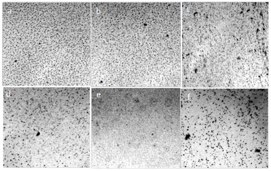 Structure of liquids in thin films (~8 μm), enclosed between the objective and coverslip: (a) distilled water; (b) 1% NaCl solution; (c) 2% NaCl solution; (d) 3% NaCl solution; (e) 4% NaCl solution; (f) is a saturated NaCl solution. Optical microscopy. The width of each frame is 1 mm. The liquid layer thickness is 8 µm.