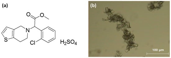 Clopidogrel bisulfate (CLP) is a drug with antiplatelet activity which is used for the treatment of several blood vessel diseases related to platelets such as angina, arrhythmia peripheral arterial occlusive disease, stroke, cerebral arteriosclerosis, and myocardial infarction. Its chemical name is (+)-methyl--5-[4,5,6,7-tetrahydro-[3,2-c] thienopyridyl]-(2-chlorophenyl)acetate hydrogen sulfate [15] (Figure 1a). At present, six types of CLP polymorphs have been reported, and among them form-I and form-II crystals are selectively used for the manufacturing of CLP drugs [16,17]. Form-I and form-II crystals are enantiotropic polymorphs. In addition, it is reported that form-II crystals are more stable than form-I crystals at room temperature because form-II crystals are thermodynamically stable at lower temperatures than their transition temperature and form-I crystals are thermodynamically stable at higher temperatures than their transition temperature [18]. Besides, it is also reported that, monoclinic form-I crystals have higher density and solubility than orthorhombic form-II crystals [19]. Therefore, pharmaceutical industries prefer the high soluble form-I crystals over form-II crystals. However, as the polymorphic transformation speed from form-I crystals to form-II crystals occurs within only 10 min, form-I crystals have been harvested via very complex techniques [20,21,22]. Further, form-I crystals are irregular, rectangular shaped crystals and form microcrystalline powder (Figure 1b).