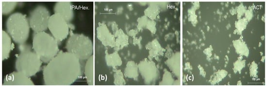 Figure 2 presents Video-microscopic images of CLP agglomerates crystallized at 35 °C at a stirring speed of 500 rpm when either isopropyl alcohol/n-hexane (IPA/Hex), n-hexane (Hex), or acetone (ACT) was used as the anti-solvent. Spherical CLP crystals were obtained when the IPA/Hex mixture was used as an anti-solvent (Figure 2a). However, non-spherical agglomerates were obtained when Hex or ACT was used as an anti-solvent (Figure 2b,c).