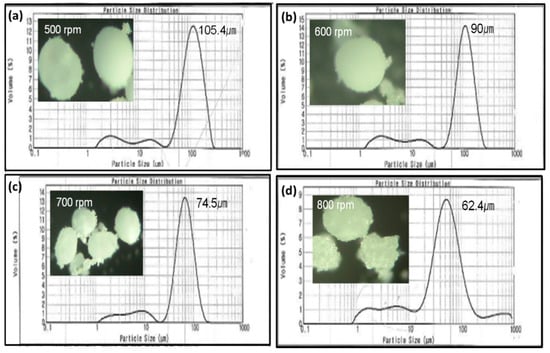 Video-microscopic images and particle size distributions of CLP agglomerates obtained when IPA/Hex [40:60, v/v] was used as anti-solvent at a stirring speed of (a) 500 rpm, (b) 600 rpm, (c) 700 rpm, and (d) 800 rpm.
