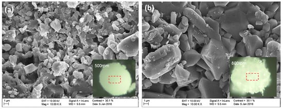 It is also notable that the sizes of the individual crystals forming the agglomerates prepared at a stirring speed of 800 rpm are larger than those formed at a stirring speed of 500 rpm (Figure 5). The larger individual crystal sizes may indicate that the high stirring speed of 800 rpm facilitates polymorphic transformation, and thus, produces the larger crystals. Interestingly, small crystals are also observed in the agglomerate prepared at 800 rpm. In fact, the small crystals within the large crystals looked similar to those of the spherical particles shown in Figure 5a and may be crystallized from a confined solution within agglomerates. PXRD data showed that the agglomerates formed at a stirring speed of 800 rpm were a mixture of Forms I and II, and it is speculated that the large crystals were Form II and the small crystals were Form I (Figure S1).