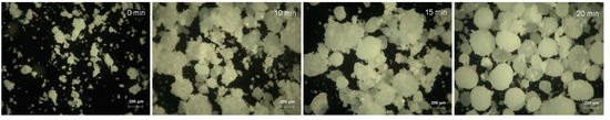 In-situ monitoring of agglomerate formation during crystallization (35 °C, 500 rpm, and IPA/Hex [v/v 40:60] as an anti-solvent) was conducted using a video-microscope at 600× magnification. At the beginning of the crystallization, small non-agglomerated particles were formed (Figure 6). The microscopic image taken at 10 min showed that the agglomerates had begun to form but were not yet spherical and did not have a smooth surface. Spherical agglomerates with a smooth surface started forming at 15 min and had finished by approximately 20 min. The schematic process of forming spherical agglomerates with smooth surfaces is illustrated in Figure 7.