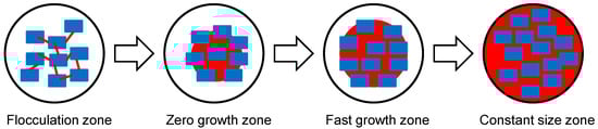 On the basis of the in-situ monitoring, it can be hypothesized that the formation of spherical CLP agglomerations follows the four stages proposed by Bermer and Zuider Wag, the flocculation zone, zero growth zone, fast growth zone, and constant size zone [10]. In the flocculation zone, a bridging liquid is often considered necessary, but in our experiment floccules were formed without it. The floccules started to form into agglomerates at 10 min. In the fast growth zone, the rough agglomerates began to be filled in with small particles to make densely packed agglomerates. Finally, the surface smoothing process began and the formation of spherical particles with smooth surfaces was completed in the constant size zone (Figure 6).
