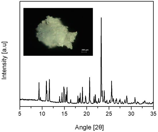 PXRD pattern and video microscope image of CLP crystals obtained at 35°C and IPA/Hex [v/v 40:60] antisolvent composition, without agitating the solution.