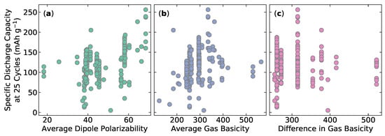 Specific discharge capacity at 25 cycle (mAh g) versus the following descriptors: (a) mean of the dipole polarizability; (b) atomic volume maximum difference; and (c) the mean of the gas phase basicity.