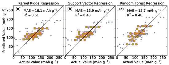 Machine learning prediction results for specific discharge capacity at 25 cycles (mAh g) using: (a) kernel ridge regression; (b) support vector regression; and (c) random forests regression. Training (blue circles) and test (orange squares) performance show similar behavior. The mean absolute error (MAE) and coefficient of determination (R) are shown. Dotted lines are included to help visualize ideal model performance.