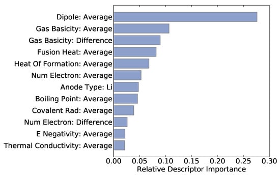 Descriptor importances can be extracted from the random forest model to determine which descriptors are most important for a successful prediction. Figure 3 shows the top twelve descriptors. Among the top descriptors are average dipole polarizability, average gas phase basicity, and the average heat of fusion. Electrochemical batteries rely on the insertion and removal of ions and the associated reduction–oxidation reaction. Therefore, the gas phase basicity (that is, the change of Gibbs free energy during deprotonation) is likely a pertinent materials descriptor which might lend itself to mechanistic analysis. Other descriptors such as heat of fusion or dipole polarizability are much less intuitive but could, hypothetically, play a subtle or higher-order role in determining Li-ion battery properties.