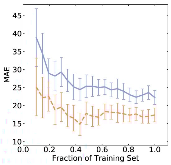A decrease in mean absolute error (MAE) specific discharge capacity at 25 cycles (in mAh g) is shown as a function of dataset size using the SVR algorithm. Blue (orange) represents the performance of the test (training) set. Error bars show the standard deviation (obtained by repeating the calculation 50 times, each with a random sampling of the training data).