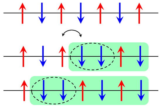 The S = 1/2 Heisenberg antiferromagnetic (HAF) spin chain with the nearest-neighbor (nn) interactions has a unique ground state with power-law correlations and the gapless excitation spectrum [39]. Using a concept of the valence bonds, this ground state has a character of a resonating-valence-bond (RVB) state, in which the quantum fluctuations restore the translational symmetry and mix in the bonds of greater length than those connecting only the nn spins [40]. An alternative approach is the mapping of the quantum spin 1/2 HAF chain to a chain of interacting spinless fermions [26]. The absence of the fermion (hole) at a site i means a spin state , whereas the presence of the fermion (particle) means . In this language, the model becomes a realization of the 1D Tomonaga–Luttinger liquid [41]. A corresponding ground state has correlations decreasing as a power law with a distance and elementary excitations form a particle-hole continuum. The excitation of a single hole carrying spin 1/2 is called a spinon and can be created by a turning half of the chain upside down which results in the two neighboring sites with the spin up. The x-y part of the Hamiltonian in the Equation (3) moves the spinon by two lattice sites (Figure 1).