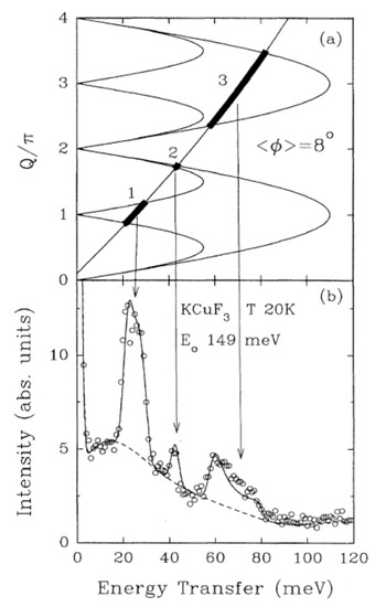 (a) Spectrum of the S = 1/2 HAF chain in zero magnetic field. The thin solid line represents a scattering trajectory for a detector at the scattering angle of 8′ and an incident energy of Eo = 149 meV in KCuF3. The scattering occurs when the trajectory intersects with the continuum (bold line); (b) Scattering measured in the low-angle detector banks at T = 20 K. (Reproduced with permission from reference [42]).